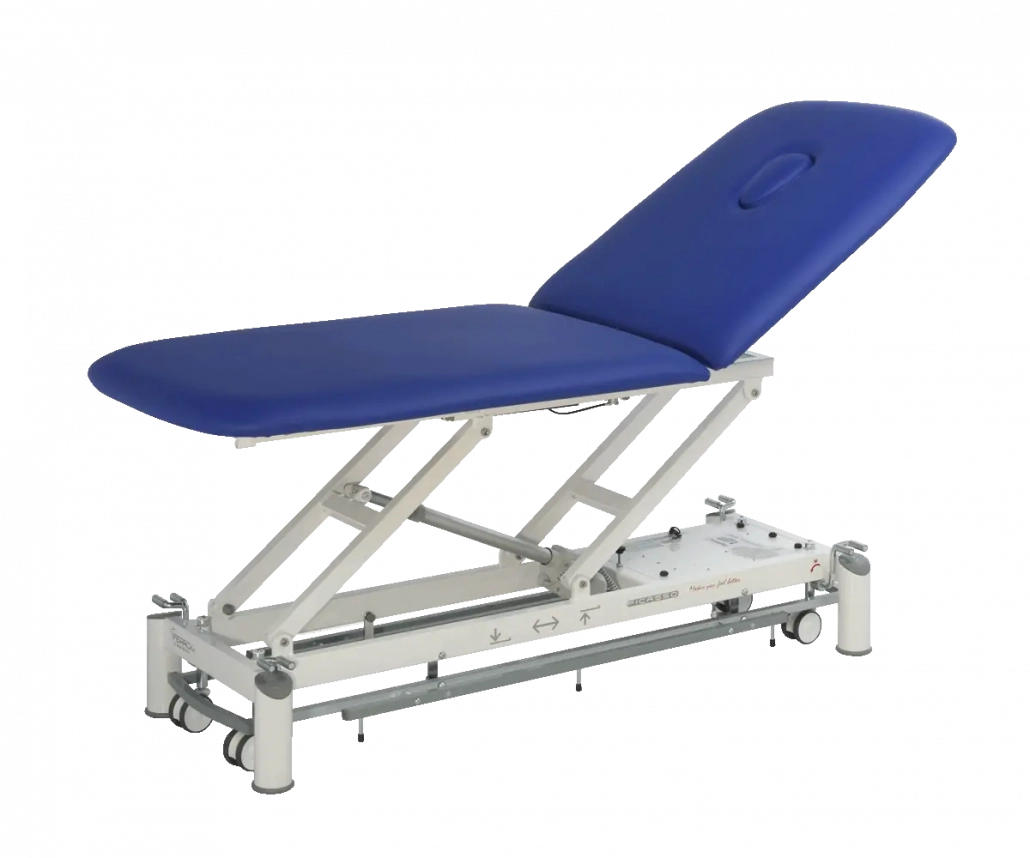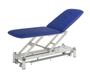 Table à hauteur variable assisté par vérin électrique pour thérapie, massages et soins médicaux.